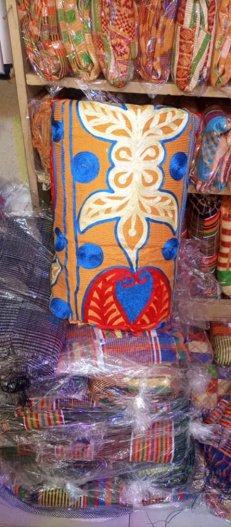 LE KENTÉ (AUTREMENT NOMMÉ KITA) MON ETOILE BRILLE, LE PAGNE AKAN HOMMES 4 PAGNES. Le pagne kita, kenté, ou encore Agbanmévoh, appelée' nwentom en langue akan et kete en langue ewe, est un type de tissu de soie et de coton composé de bandes de tissu entrelacées. Il est originaire des peuple Ashanti et Ewe, groupes ethniques de l'Ouest du Ghana et du Sud Togo. Ce tissu est porté par presque toutes les tribus ghanéennes. Les Akans appellent le kente « nwentoma », ce qui signifie tissu tissé. Il s’agit d’un vêtement royal et sacré, porté seulement à une époque d’extrême importance et qui était le vêtement des rois. Au fil du temps, l’utilisation du kente s’est généralisée. Cependant, son importance est restée et il est tenu en haute estime par les Ashanti. Le kente est également porté par les akans de la Côte d’Ivoire qui ont migré du Ghana. Il s'agit d'un tissu coloré et épais utilisé tel (en pagne) ou dans la confection de vêtements plus complexes. Généralement porté lors des fêtes et cérémonies, ce vêtement est symbole de noblesse et de prestige. Le kita constitue la base de l'habillement des rois et chefs Akans, Ga et Ewés. Type de tissu. Le kente ou kenté (nom Ashanti), aussi connu sous le nom de kita, est un tissu africain fait de coton et de soie et composé de bandes de tissu cousues ensemble pour former des motifs et des figures aux couleurs vives. Il tient une place importante dans la culture et l'économie de plusieurs peuples d'Afrique de l'Ouest, dont les Ashantis, les Akans et les Ewes, au Ghana et en Côte d'Ivoire notamment. Dans la culture Akan, le pagne n'est pas qu'un simple tissu : il est porteur de nombreux messages. Chaque détail est réfléchi : il s'agit d'un langage et d'un véritable code de conduite. C'est pourquoi, les couleurs, les motifs et les figures du tissu ont des significations, qui varient selon les cultures. Signification des couleurs. Le Kente est un tissu très coloré mais aussi extrêmement codifié : aucune couleur n'est laissée au hasard. Chaque couleur présente a une signification bien précise: Kente avec motifs ashantis. Blanc : Symbole de la pureté, de l’innocence, de la spiritualité et de la paix (psychique, collective et intérieure). Elle rappelle avec soin le caractère sacré et divin. Toutefois, bien que sa présence dans le tissu reste minoritaire, elle y est parfois présente en filigrane. Jaune : Symbole de l’opulence, de la préciosité, de la santé et de la richesse sous toutes ses formes - financière, spirituelle, intellectuelle - mais aussi de la fertilité. Or : Symbole de la royauté, de la richesse, d'un statut social élevé, de la gloire mais aussi de la pureté spirituelle. Noir : Symbole du deuil, de l’obscurité, du mal, du secret et du mystère mais aussi de la maturité et de l'énergie spirituelle. Vert: Symbole de la vie, de la croissance, de la bonne santé et de l’harmonie. Il rappelle également la végétation, les récoltes, la croissance mais aussi le renouveau spirituel. Bleu: Symbole de l'élévation, de la communion, de l'humilité, de la patience, de la sagesse, de la paix, de l'harmonie et de l'amour. Gris : Couleur de la cendre, il symbolise la guérison et les rituels de purification. Marron Couleur de la Terre-mère, il représente la guérison. Rose: Symbole de la femme, l'essence de la vie, calme, douceur7Violet: Symbole de la féminité. Rouge: Symbole de l'effusion de sang, des rites sacrificiels et de la mort. Argent: Couleur de la lune, il symbolise la sérénité, la pureté et la joie. Les couleurs jaune et or sont fort présentes dans le Kente car, étant un tissu royal, le roi qui l'arbore lors de manifestations publiques montre par celui-ci qu'il incarne chacune de ses vertus, chaque signification. De plus, ces couleurs comparables aux rayons du soleil rappellent la divinité bienfaitrice. Le noir est souvent utilisé dans les cérémonies initiatiques et purificatrices. Il s'agit d'une couleur ambivalente entre obscurantisme et élévation spirituelle. Puisqu'il combine négativité et positivité, le noir est à la fois craint et vénéré. Sa présence discrète dans le kente rappelle que les nobles sont avant tout les gardiens du trône. Le vert rappelle la forêt, la naissance et la jeunesse, sans oublier l'humanisme. Souvent associé au bleu et au jaune, il complète la signification des tenues d’apparat, rappelant ainsi que la richesse et la noblesse repose avant tout sur l’humilité, l’humanisme et l’équilibre. Le bleu évoque le ciel et la mer, rappelant ainsi que le roi et tous les nobles ont une parfaite maîtrise de leur milieu et de leur environnement. Quand il est associé au jaune, au blanc et au rouge, il exprime l'idée que la richesse et la puissance reposent sur la spiritualité, procurant ainsi tranquillité et équilibre mais surtout stabilité pour les pouvoirs. Motifs traditionnels ashantis Le Kenté ashanti est connu pour ses nombreuses formes géométriques. Chacune d'entre elles revêt une signification qui lui est propre: Carré : symbole de la terre, du cosmos, de la féminité; Triangle: symbole de la naissance, de l'existence et de la mort; Losange: symbole de la dualité existentielle entre l'existence de l'homme et son destin; Cercle: symbole de l'infini et de la divinité; Croix: symbole de l'eau, du feu et de la force. Les motifs traditionnels Ashanti sont également liés à de nombreux proverbes et légendes, qui permettent de mieux comprendre l'utilisation faite de ce tissu: Le Tabouret d'Or (The Golden Stool); symbole du pouvoir absolu au Ghana. Selon la légende, il a été envoyé des cieux, il y a 800 ans. De nos jours, le roi des Ashantis s’y assoit chaque fois qu’il se retrouve en public. Dieu est grand (God is great), aussi connu sous le nom de Ne jamais abandonner (Never give up) Ohene Anewa – L’œil du roi, le Roi voit toutNkyimkyim – Zigzag, la vie n’est pas un 
