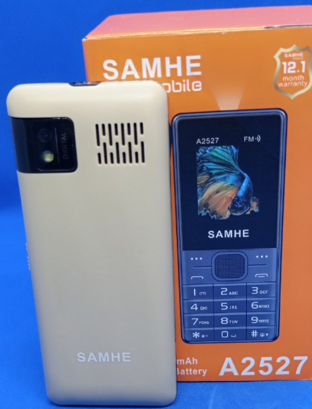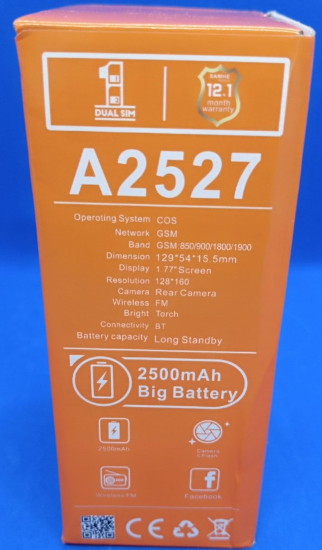 SAMHE A2527 Système:COS Réseau: GSM Dimension: 129*54*15.5mm Ecran: 1,77" pouce Résolution: 128*160 Caméra: Arrière Fm Lampe torche bluetooth Batterie: 2500 mAh
